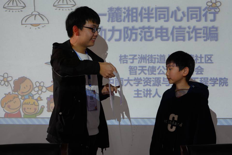团委学生会、“一麓湘伴”志愿服务专项组携手中南大学“中南小黄帽”工作室于八字墙社区公共服务中心室内活动室开展了“一麓湘伴同心同行,助力防范电信诈骗”安全宣讲活动。“中南小黄帽”工作室指导老师聂溪流、本科2019级辅导员肖碧涵和本科2021级辅导员李嘉参与本次活动并对本次活动。