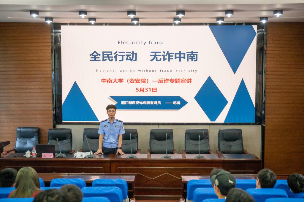 活动伊始,毛博警官以《全民行动,无诈中南》为主题进行了精彩宣讲。他分别从电信网络诈骗的含义、电信网络诈骗高发案件类型以及电信网络诈骗防范的技巧等多个方面进行了详细阐述,通过生动的案例和真实的数据向同学们展示了电信诈骗的多样性与危害性。针对电信诈骗防范,毛警官提出“三不一多一及时一下载”的应对办法,呼吁同学们提高警惕,远离电信诈骗,共建“无诈中南”。