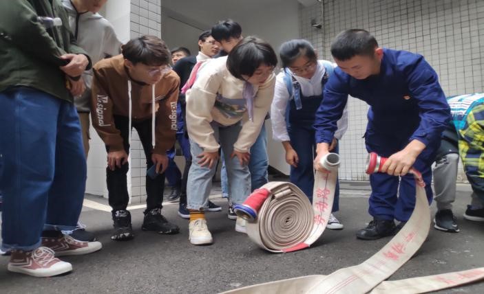 部分同学亲自体验了一些消防设备。“背上它之后,我才明白了消防员的负重前行”,一位同学背上15公斤重的空气呼吸罐后感慨道。他们承受着巨大的重量,却仍旧迈着迅捷的步伐前往救援,同学们都不禁为消防队员不畏艰辛、负重前行的精神感到敬佩。