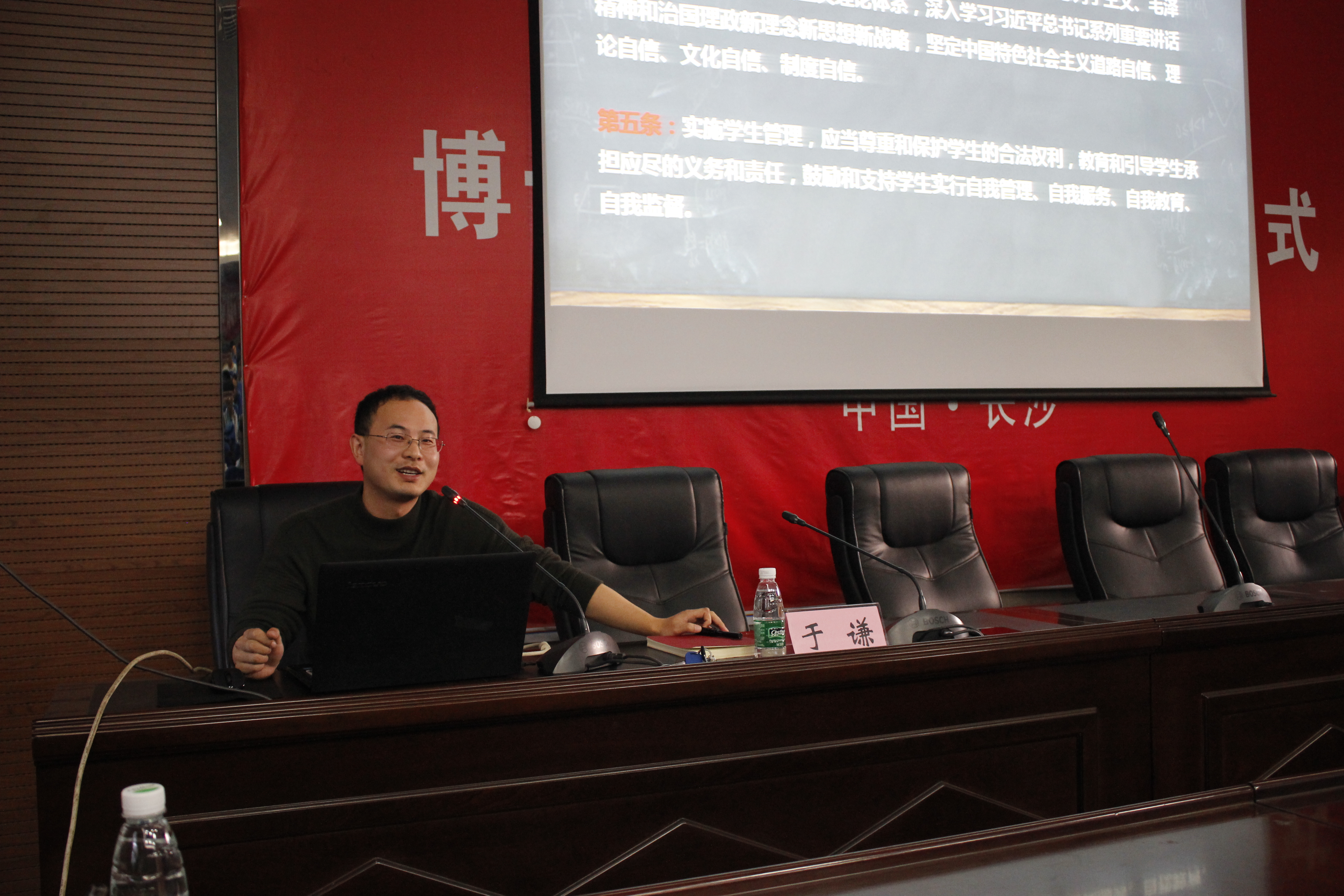 首先,在校纪校规方面,于老师请在座各位研究生齐声诵读《高等学校学生行为准则》里的八条规定,接着解释了中南大学的校训、校风,诠释了社会主义核心价值观及《普通高等学校学生管理规定》的各项义务及要求,并希望在座的各位同学要谨记于心,恪守规章,做一个合格的中南人。此外,于老师特别强调了树立程序意识与规则意识的重要性。