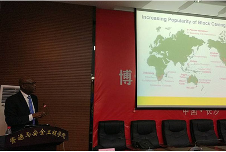 10日上午Fidelis T Suorineni教授带来了两场学术报告,主题分别为Hypothesis for effective hydraulic fracturing in crystalline rocks和Effective hydraulic fracturing in crystalline rocks as applied to block cave minmg preconditioning and reactivation of stalled caves。教授主要介绍了他在岩石崩落法研究中取得的最新成果,并向同学们阐述了“水力压裂裂纹”问题研究中的应力阴影效应及定向水力压裂等理论。随后,他的学生何青源博士就其团队研究内容进行了拓展补充。11日上午,Fidelis T Suorineni教授围绕主题:Shear loading Of orebodies—The unrecognized threat to safe and productive mining,并结合其科研团队设计的工程实验为同学们详细演示了工程实践中矿柱尺寸设计的各项理论与影响因素。
