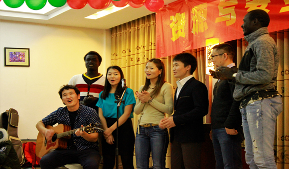 活动伊始,团学会文艺部干事以一支《咋了爸爸》的舞蹈拉开了晚会序幕,活泼又有趣的舞蹈营造出一种温暖、轻松的新年氛围。紧接着,研究生罗焱带来一曲吉他弹唱《寂寞的季节》,空灵的嗓音完美诠释了歌曲意境。随之而来的是全体蒙古硕博研究生为大家带来的具有蒙古特色的传统歌曲,欢快的曲调感染着在场所有观众。我院研究生王明虎的吉他弹唱《姑娘》强烈的舞台表现力让大家不由自主地随着歌曲摇摆。本科生田泽同同学的歌曲串烧更将现场气氛推上小高潮。随后,热情的留学生极具异域风情的舞蹈吸引了现场观众与老师共舞。此次晚会不仅节目精彩纷呈,中途还穿插了抽奖与“合力吹气球”、“我是食神”、“你画我猜”等互动游戏环节,活动现场高潮迭起,观众笑声、掌声、喝彩声不断,每个人都沉浸在新年和乐融融的氛围中。最后,所有中外学子与在场领导老师合影留念,为告别2016、走向2017定格下最美的一幕。