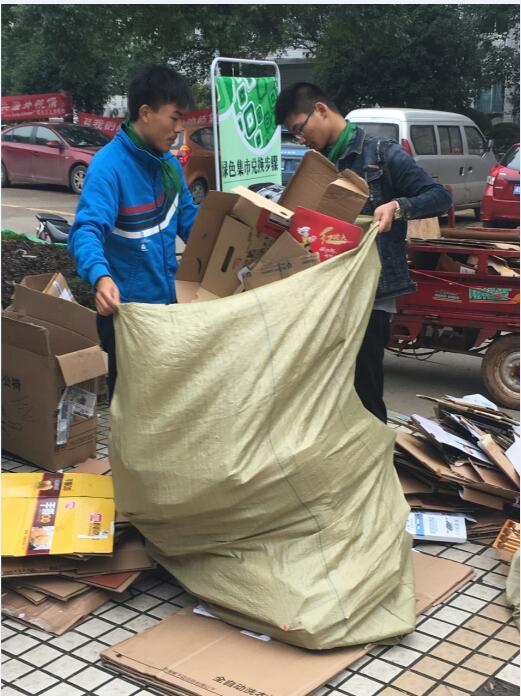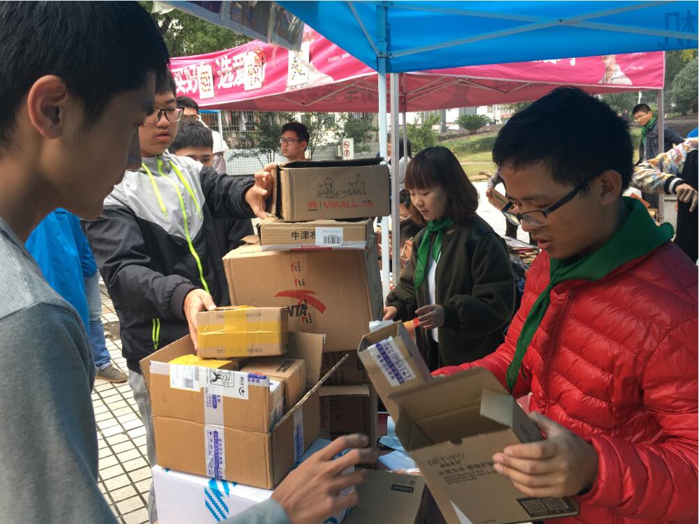扫楼人员或其他同学收集完快递盒子后,便到了最期待的环节:那就是用快递盒子换精美礼物(有多肉植物、手工相框、手工纸盒等环保物品)。值班人员佩戴绿领巾,保持微笑与礼貌,积极引导来参与活动的同学参与活动。每个快递盒子兑换一个绿色币,绿色币越多当然得到的礼物也就会越好。值班人员对同学们耐心讲解规则,认真工作,将回收到的快递盒子进行拆卸并整齐摆放在回收处帐篷的后侧,达到一定数量后,将它们转移到特定地方进行存放。