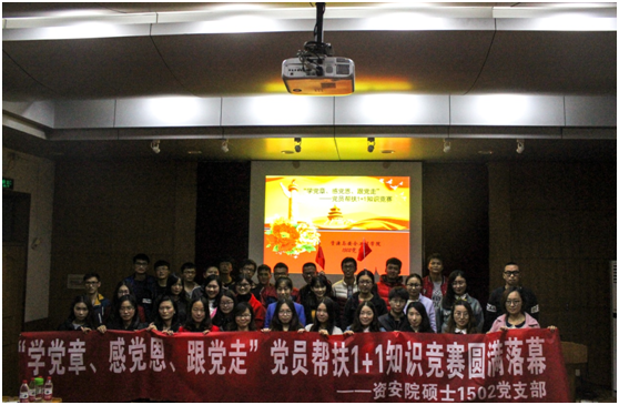 硕士1502党支部在采矿楼301报告厅举办了“学党章、感党恩、跟党走”——党员帮扶1+1知识竞赛。参加本次竞赛的有四十余人,现场气氛热烈。
