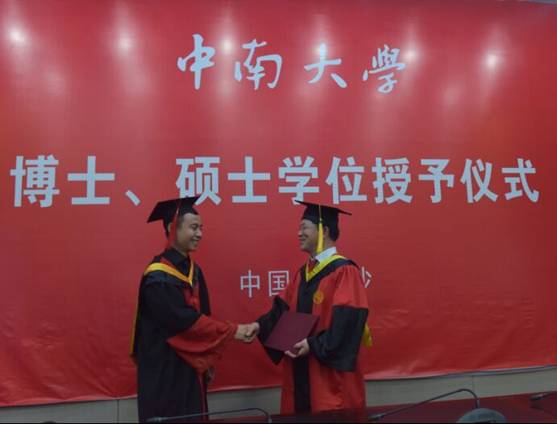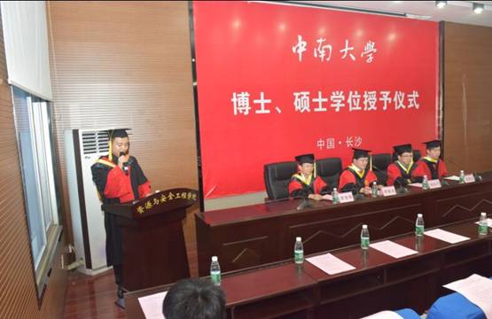 毕业典礼在庄严的国歌声中拉开帷幕。副院长史秀志教授宣读了《中南大学学位评定委员会关于授予硕士、博士学位的通知》和学位授予名单。随后,由党委李顺求书记致辞,他首先表达了对毕业生们衷心的祝贺和不舍之情,同时还给毕业生提出几点建议:毕业生要树立终身学习的观念,走上工作岗位要向一线技术工人学习;要具备良好的心态,积极向上的处理好所有的事情;最后要加强与母校和我院的沟通,积极进取奋力拼搏,争做社会栋梁之才。随后,由博士生代表田森和硕士生代表董春芳致辞,他们简要回顾了研究生期间与导师的朝夕相处、同窗情谊、耕耘收获,并表示将牢记领导和老师们的殷切期望,不忘校训,以饱满的热情和昂扬的斗志投身社会,服务社会,奉献青春,实现价值,感恩母校。毕业典礼的最后,院长周科平教授致辞,他希望毕业生们能够运用在校所学知识和技能,尽快融入社会实践,完善自我,提升能力,服务社会。他还表示,母校永远是毕业生的坚强后盾,母校永远牵挂大家,支持大家,也希望毕业生时刻心系母校,关心、支持母校的发展,用实际行动和卓越表现为母校增光添彩。
