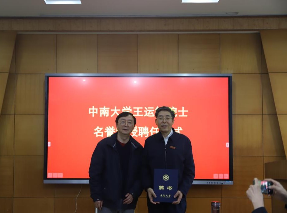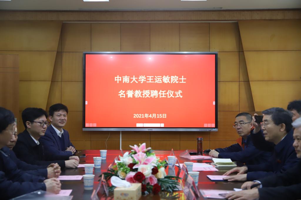 概况。田庆华处长宣读了《中南大学关于聘任王运敏院士为我校名誉教授的决定》,并由胡岳华常务副校长为其颁发聘书,授予校徽。