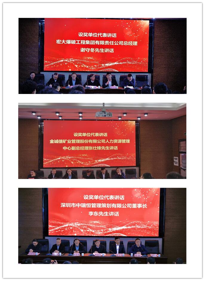 宏大爆破工程集团有限责任公司总经理谢守冬先生、金诚信矿业管理股份有限公司人力资源管理中心副总经理张仕锋先生和深圳市中瑞恒管理策划有限公司董事长李东先生分别代表设奖企业发言。他们首先向所有获奖的学生表达了衷心的祝贺,然后深情地谈到了自己或单位与中南大学的情感渊源,高度肯定了中南大学各方面所取得的巨大成绩,表示设立奖励金助力教育事业的发展是企业义不容辞的责任,他们勉励大家:要再接再厉,力争上游,还要提高眼界,放眼全球,更要不忘初心,报效国家。同时还表示大家要同企业保持联系,加强交流。