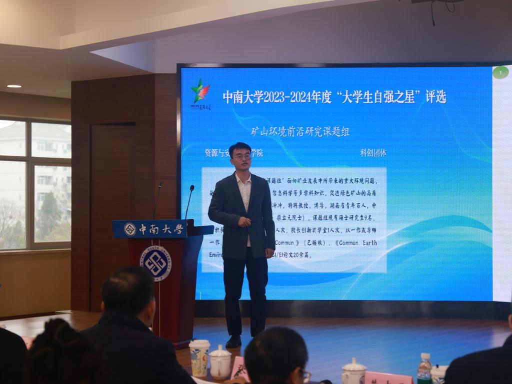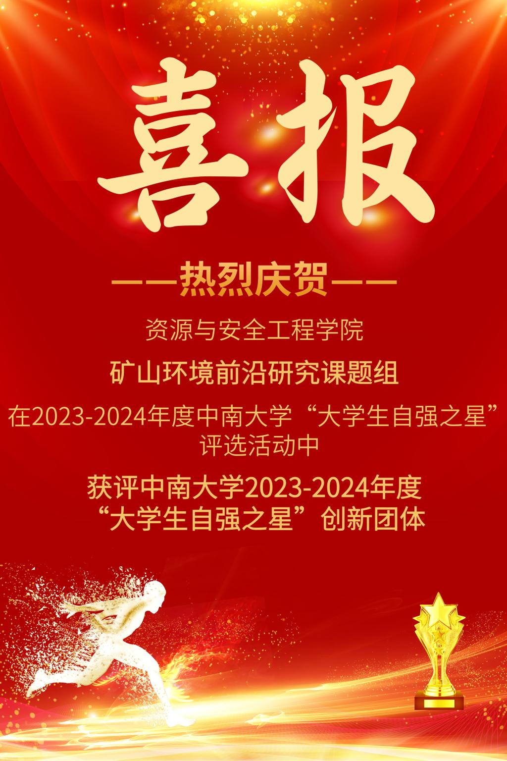 近日,在由共青团中南大学委员会、中南大学教育基金会主办,中南大学研究生会承办的2023-2024年度中南大学“大学生自强之星”评选活动中,我院“矿山环境前沿研究课题组”脱颖而出,获评中南大学2023-2024年度“大学生自强之星”创新团体。