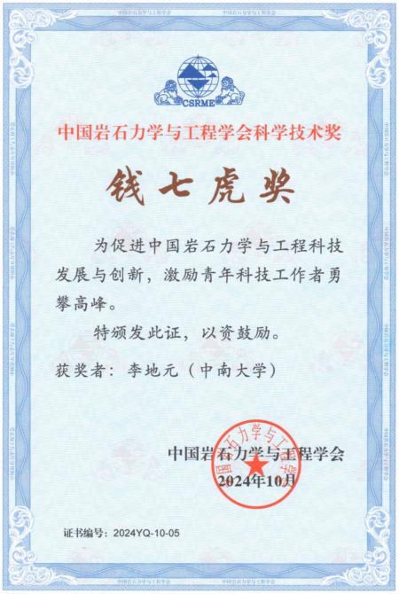 2024年11月1-3日,由中国岩石力学与工程学会和国际地质灾害与减灾协会联合主办的CHINA ROCK 2024第二十一次中国岩石力学与工程学术年会在成都主会场举行。在会议闭幕式上,颁发了第十五届中国岩石力学与工程学会科技奖。我院李地元老师从众多青年科技工作者代表中脱颖而出,荣获“钱七虎奖”。