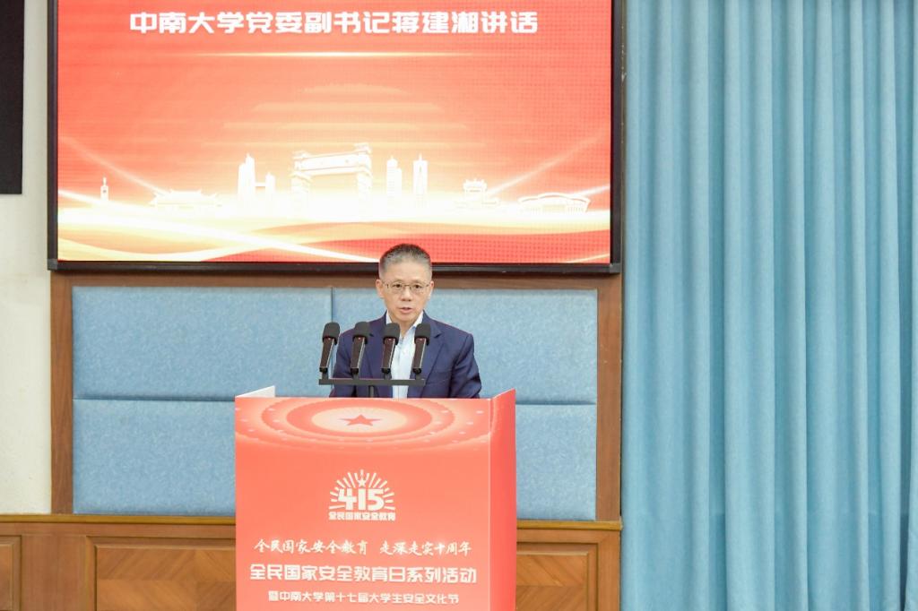 蒋建湘副书记表示,长期以来,中南大学深入贯彻落实习近平总书记关于总体国家安全观的重要论述,将国家安全教育作为立德树人的基础性、战略性工程,纳入学校双一流建设全局和人才培养全过程。学校连续多年开展大学生安全文化节,从学科布局、课程设置、文化引领、产品供给上下功夫,构建完善的国家安全教育体系,有效推动总体国家安全观入脑入心、见行见效,为培养担当民族复兴大任的时代新人筑牢坚实根基。广大学生作为强国建设、民族复兴的生力军,要在深入学习践行总体国家安全观上走在前,做表率。希望同学们认真学习国家安全知识,不断提升能力素养,强化责任担当,树牢国家安全底线,努力成为堪当强国建设、民族复兴重任的可靠接班人。