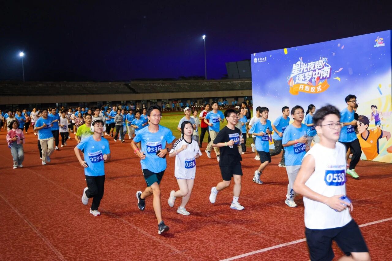 师生们在专业人员带领下舒展身体、活络筋骨。随着开跑口令的响亮发出,鲜红的活动旗帜在夜色中率先扬起,师生们紧随其后,脚步声与音乐律动共振,呼吸声与夜风细雨相融,大家热情奔跑、你追我赶、互相鼓劲,荧光手环与沿途灯光交织成校园夜景中的流动星河,营造了浓厚的校园运动氛围,生动展现了中南学子的昂扬风貌。